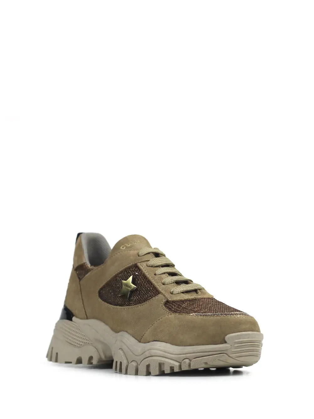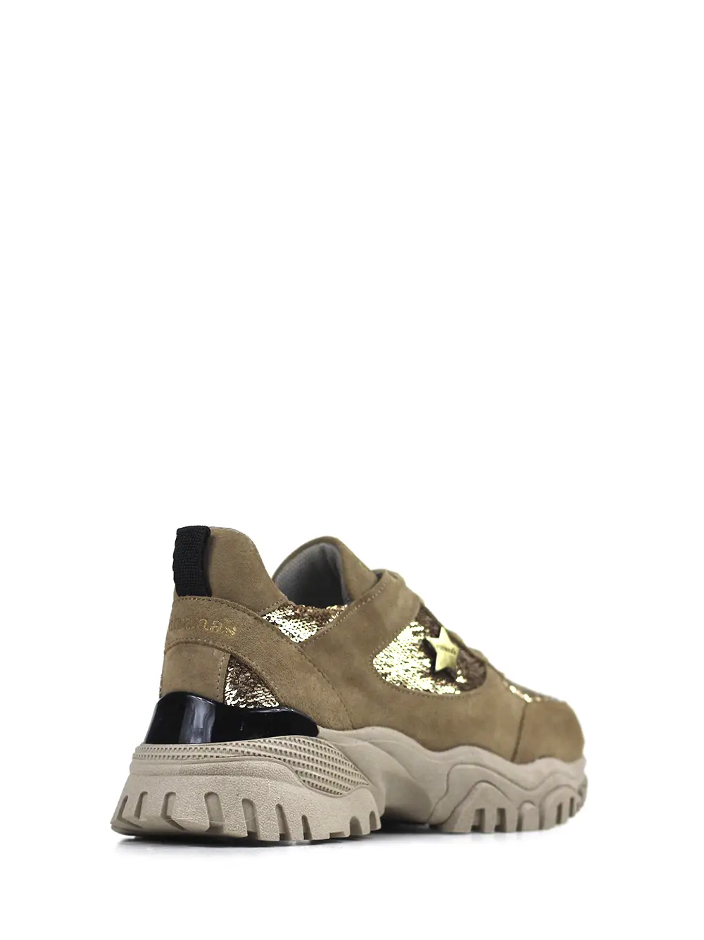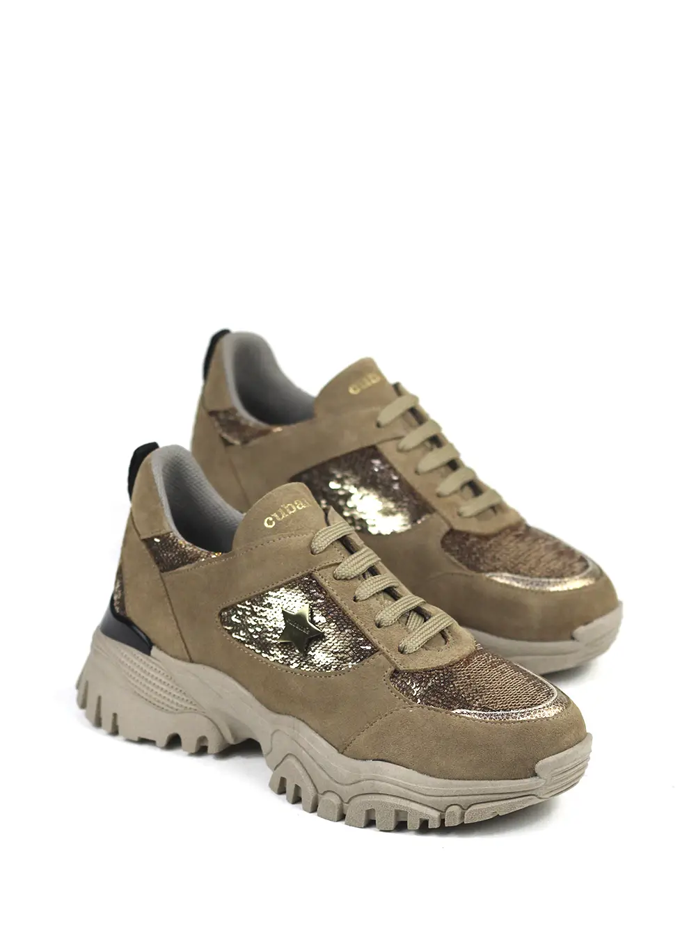 Sneakers em camurça camel e glitter dourado. Este modelo da Cubanas é a escolha perfeita para quem deseja aliar o conforto ao estilo descontraído.